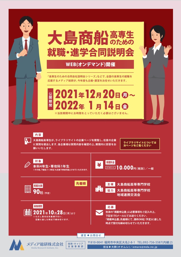 大島商船高専生のための就職・進学合同説明会が【WEB開催】(オンデマンド形式)で、2021年12月20日(月)~2022年1月14日(金)に開催されます。この機会にぜひご参加くださいますよう、よろしくお願い申し上げます。