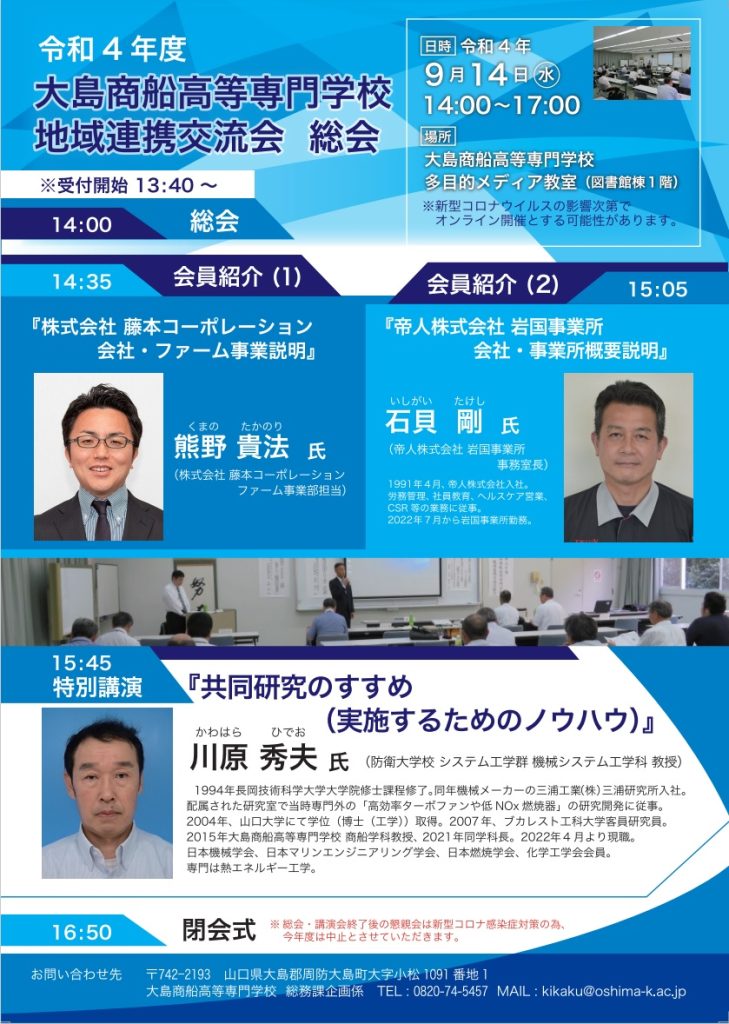 次の日程で、令和4年度大島商船高等専門学校地域連携交流会の総会および会員紹介と特別講演が開催されます。