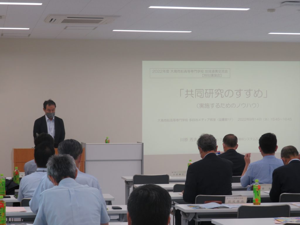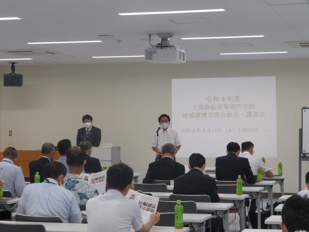 令和4年9月14日(水)に令和4年度大島商船高等専門学校地域連携交流会総会が開催されました。総会では冒頭に山田多加司会長と大島商船高専古莊雅生校長の挨拶があり、その後、山田会長が議長となり令和3年度の事業報告、決算報告、監査報告、令和4年度の事業計画(案)および予算(案)の議事について協議が行われ、滞りなく承認されました。当日は,KOSEN EXPO2022とキャリア教育フォーラムのイベント参加に関する案内もあり、地域連携交流会の参加に対するメリットについて、大島商船高専地域協力センター長の北風裕教先生より説明がありました。